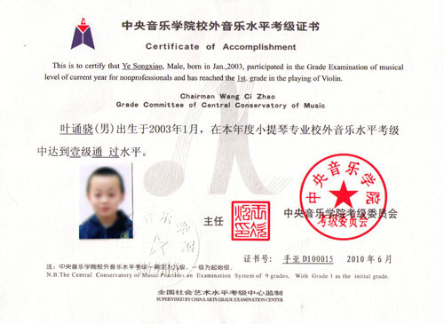叶诵骁获2010年度中央音乐学院校外音乐水平小提琴专业考级1级证书